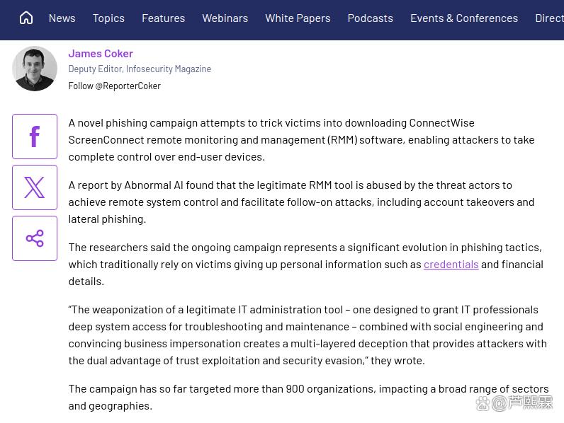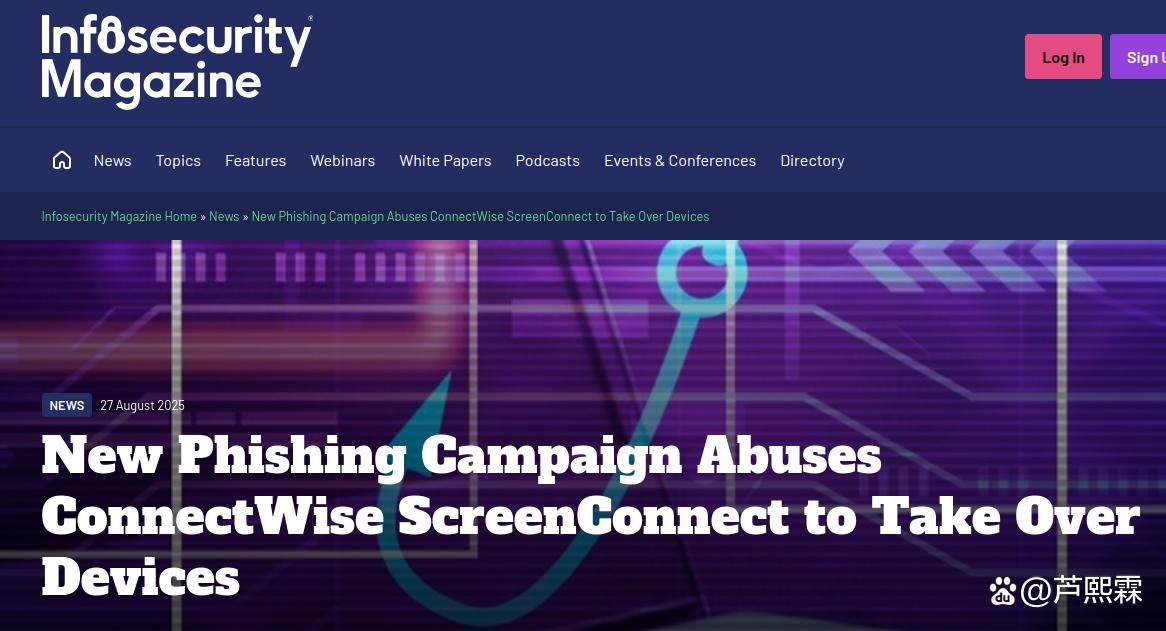 关键词:ConnectWise;ScreenConnect;远程支持工具;钓鱼攻击;信任劫持;凭证窃取;EDR;零信任