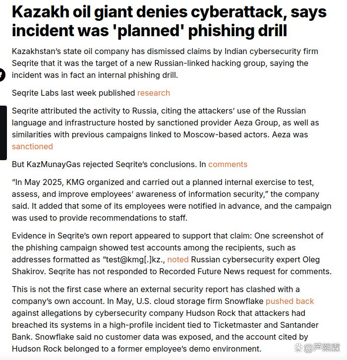 随着国家级网络行动日益频繁,能源、金融、交通等关键信息基础设施(CII)成为APT组织的重点目标。在此背景下,任何疑似入侵迹象都极易被置于“国家行为体”框架下解读。然而,2025年5月发生在哈萨克斯坦国家石油公司KazMunayGas(KMG)的事件表明,这种高度敏感的归因环境也可能导致对常规安全活动的严重误判。