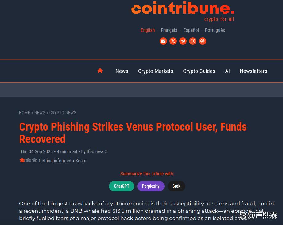 去中心化金融(Decentralized Finance, DeFi)自2020年以来经历了爆发式增长,其核心价值在于通过智能合约实现无需信任中介的金融活动。然而,随着协议复杂度和锁定资产规模的同步上升,安全威胁亦从传统智能合约漏洞逐步扩展至“人因”层面。2025年9月,BNB Chain上的主流借贷协议Venus遭遇一起高度定制化的钓鱼攻击,一名大型用户(通常被称为“鲸鱼”)在未察觉异常的情况下签署恶意授权交易,导致约1350万美元资产被转移。值得注意的是,该事件虽源于用户端操作失误,但后续资金得以近乎全额追回,凸显了当前DeFi生态中跨机构协同响应机制的成熟度。