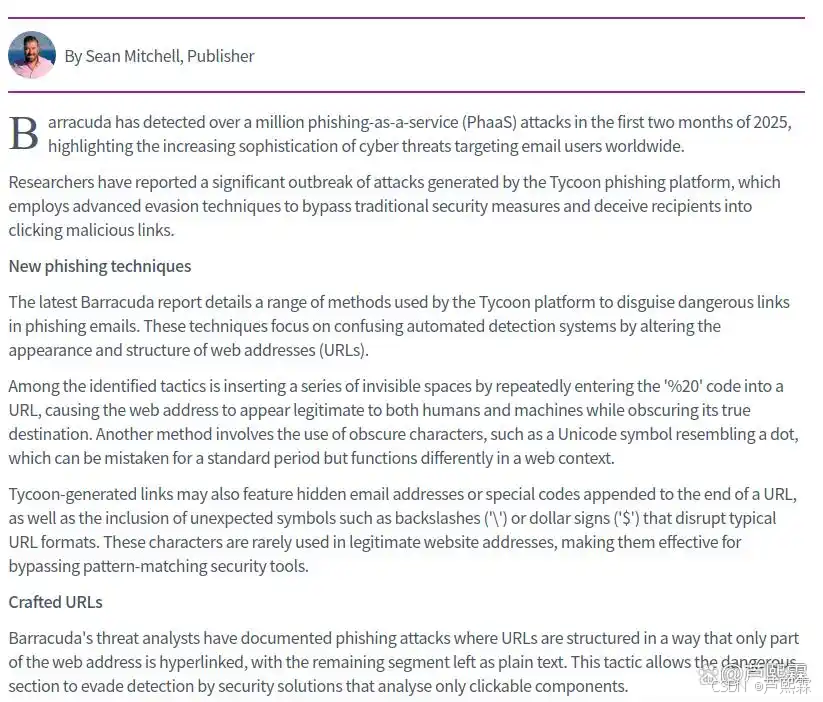 电子邮件仍是企业网络边界最脆弱的入口之一。根据Barracuda Networks于2025年9月发布的威胁报告,仅2025年前两个月,其全球传感器网络即捕获超过一百万起由“钓鱼即服务”(Phishing-as-a-Service, PhaaS)平台发起的攻击,其中以Tycoon平台为代表的新一代钓鱼工具展现出前所未有的URL构造复杂性。攻击者不再依赖简单仿冒(如micosoft.com),而是通过精心设计的链接结构,在保持人类用户感知“可信”的同时,绕过基于规则、签名或静态分析的安全网关。