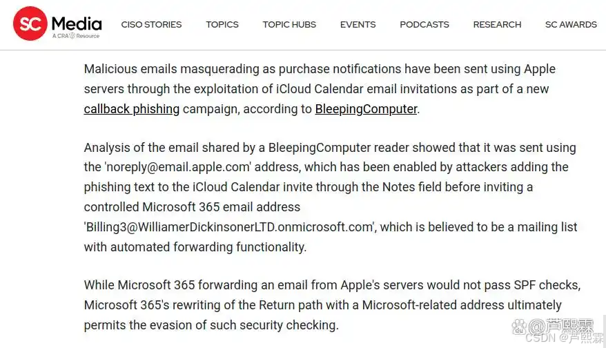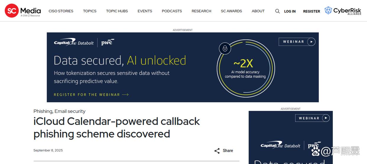 网络安全防御体系长期以电子邮件为核心防护对象。反垃圾邮件网关、URL信誉服务、附件沙箱等技术已显著压缩传统钓鱼邮件的生存空间。然而,攻击者的适应性演化从未停止。当主流通道受阻,其自然转向防御薄弱的替代媒介。2024年以来,多起高隐蔽性钓鱼事件被归因于非邮件载体,其中以Apple iCloud日历邀请为载体的“回拨型”钓鱼尤为突出。