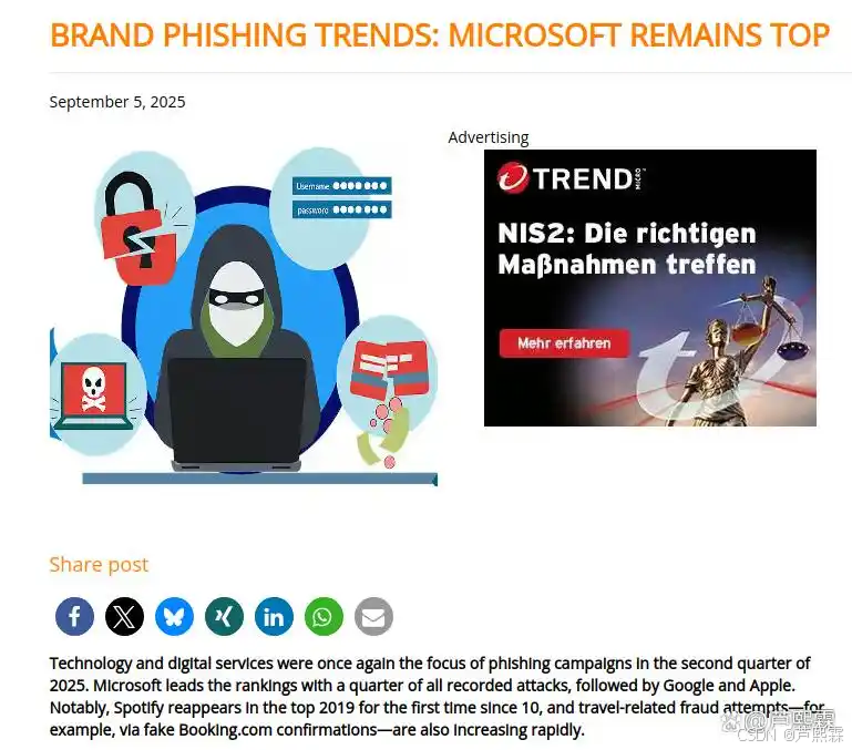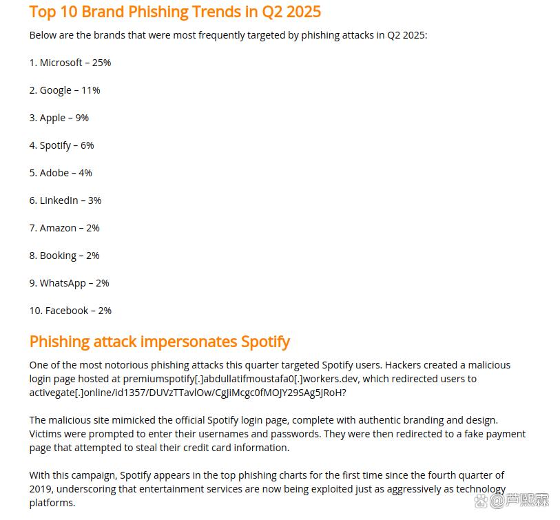 Check Point Research于2025年9月发布的报告显示,在2025年第二季度,Microsoft以25%的占比继续位居品牌钓鱼榜首,远超第二名Google(11%)与第三名Apple(9%)。值得注意的是,此次统计中首次观察到Spotify重返前五,而Booking.com相关仿冒活动激增1000%,反映出攻击者对季节性行为模式的精准利用。然而,相较于其他品牌,Microsoft仿冒攻击的技术复杂度与组织危害性尤为突出,其背后体现出攻击者对现代企业IT架构的深度理解。