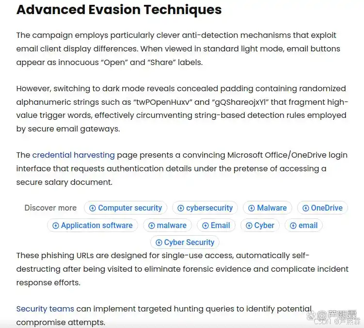 为绕过基于关键字的邮件网关检测,攻击者采用一种新颖的视觉混淆技术。在邮件HTML中,按钮标签(如“Open Document”)被包裹在带有padding样式的<span>元素内。在浅色主题下,填充内容不可见;但在深色模式下,浏览器渲染引擎会暴露隐藏的随机字符串,例如: