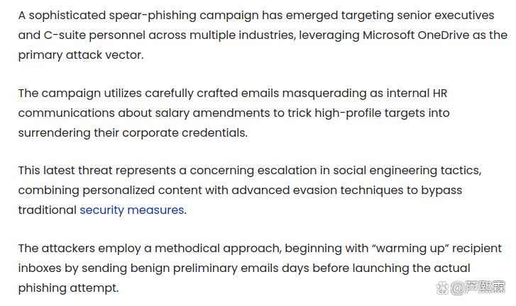 近年来,针对企业高层管理人员(C-level executives)的网络攻击呈现出高度定向化、技术复杂化与社会工程深度融合的趋势。其中,以云服务为载体的高级鱼叉钓鱼(spear-phishing)攻击尤为突出。2025年披露的一起新型攻击事件显示,攻击者利用Microsoft OneDrive作为主要传播媒介,通过伪造人力资源部门关于薪酬调整或股权授予的通知邮件,诱导目标点击嵌入的共享链接。该链接表面指向一个常规文档,实则加载伪装成Microsoft 365登录界面的钓鱼页面,并在用户输入凭证后实时中继多因素认证(MFA)请求,实现凭证与会话令牌的双重窃取。