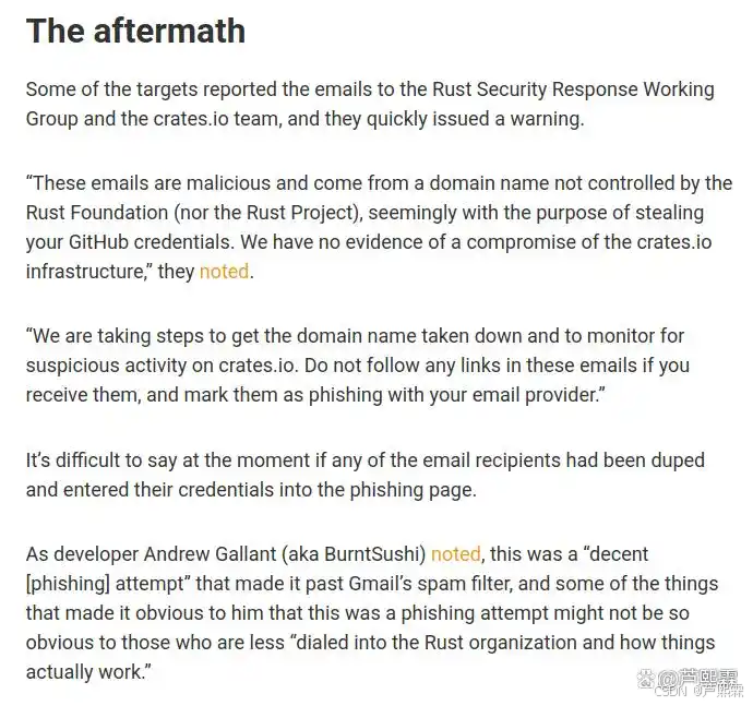 当前主流防御措施——如反钓鱼培训、邮件过滤规则——在此类高度情境化攻击面前效果有限。开发者在完成发布操作后收到“安全警报”,极易产生紧迫感而跳过常规验证步骤。同时,Rust基金会虽在事后迅速发布澄清,但缺乏事前防伪与事中验证机制,导致部分用户已在官方响应前受骗。