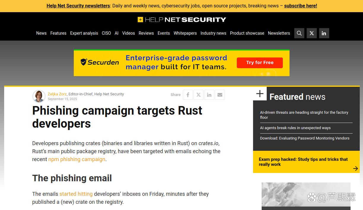 开源软件生态的繁荣建立在开发者快速发布、社区即时复用的基础之上。然而,这一高效协作模式亦引入了独特的安全挑战,尤以项目首次发布(first publish)阶段最为突出。此时,开发者处于高度活跃状态,对平台通知高度敏感,且往往缺乏对“官方通信”渠道的深度验证习惯。2025年9月中旬,Help Net Security披露的一起针对Rust开发者的钓鱼攻击事件,精准利用了这一心理与流程窗口:攻击者在目标于crates.io发布新crate后数分钟内,发送伪装成Rust基金会的安全紧急通知,诱导其点击链接并输入GitHub凭证。
