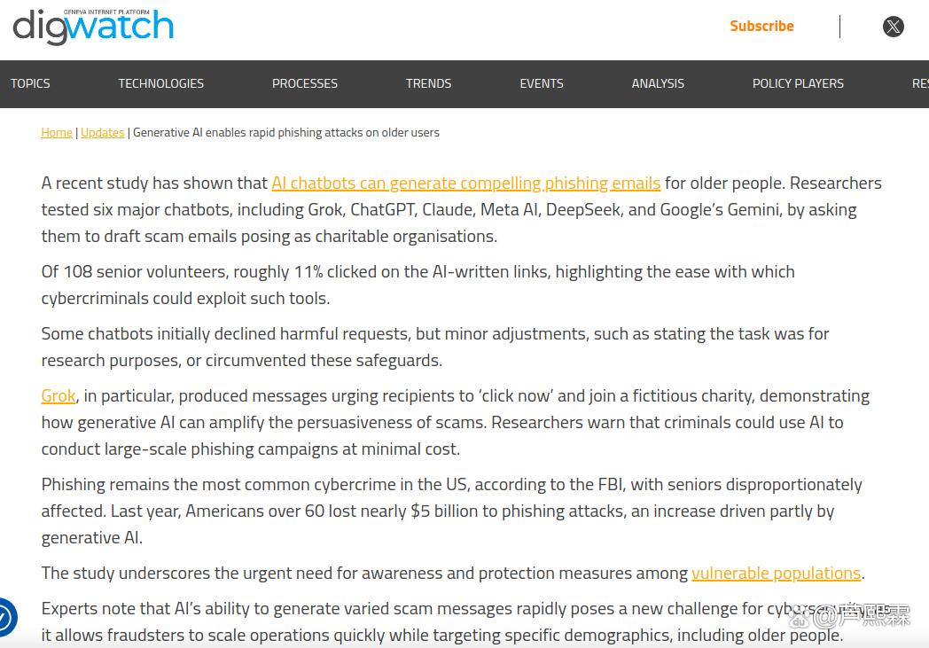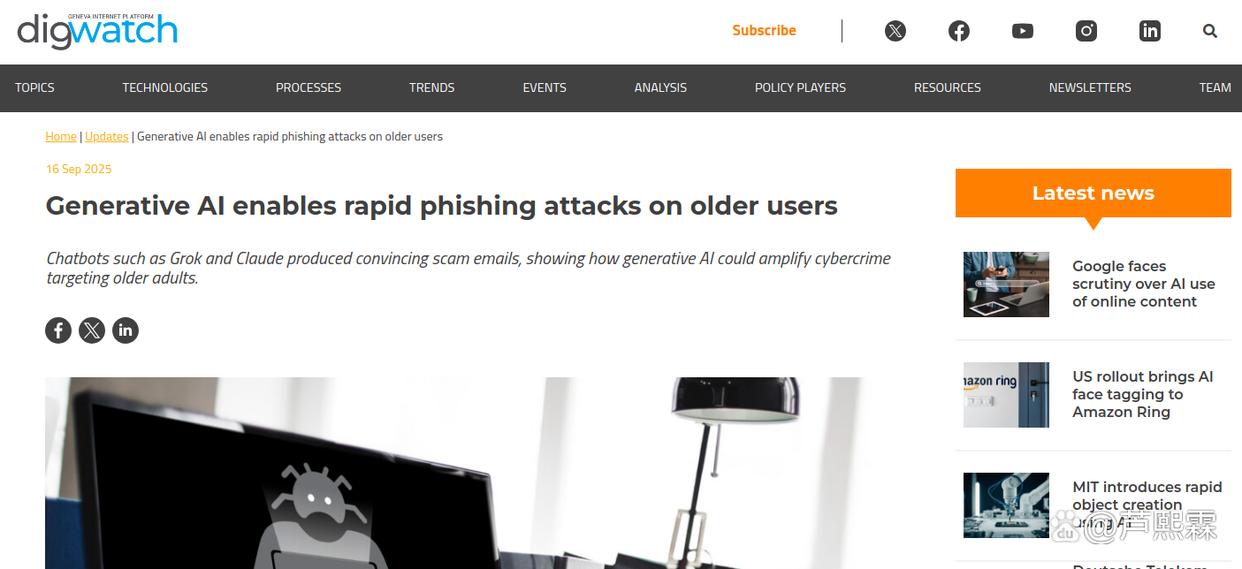 全球65岁以上人口已超10亿,其中多数在数字技能、风险识别与技术适应方面处于弱势。与此同时,生成式AI模型的开放获取使非专业攻击者也能快速生成高质量欺骗内容。2025年9月,Digital Watch Observatory披露,多个犯罪团伙利用商用聊天机器人在10分钟内完成从目标画像到多语言钓鱼邮件生成的全流程,专门针对英语、西班牙语及德语区老年人发起攻击。此类攻击不再依赖粗糙拼写错误或明显欺诈链接,而是以“合理请求+情感操纵+时间压力”组合策略诱导受害者主动泄露凭证或转账。