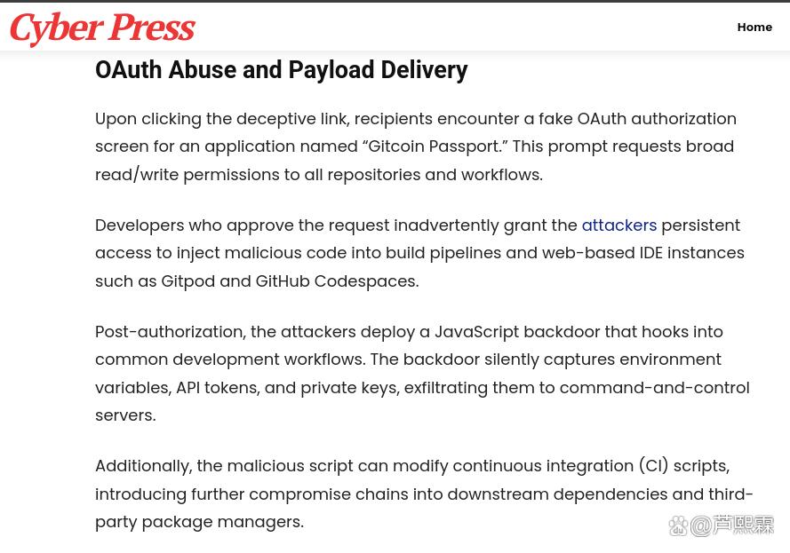 本文聚焦于该类“合法平台转发型”钓鱼攻击的技术机理、攻击路径演化及其对软件供应链安全构成的系统性风险。通过复现攻击核心环节、分析OAuth滥用模式、评估现有防御措施的有效边界,并结合实际代码示例,提出一套面向开发者与组织的纵深防御框架。全文结构如下:第二部分剖析攻击技术细节;第三部分讨论攻击对CI/CD与依赖管理的影响;第四部分评估当前主流防护手段的局限性;第五部分提出多层次缓解策略;第六部分给出可落地的代码级检测与响应方案;第七部分总结全文并指出未来研究方向。