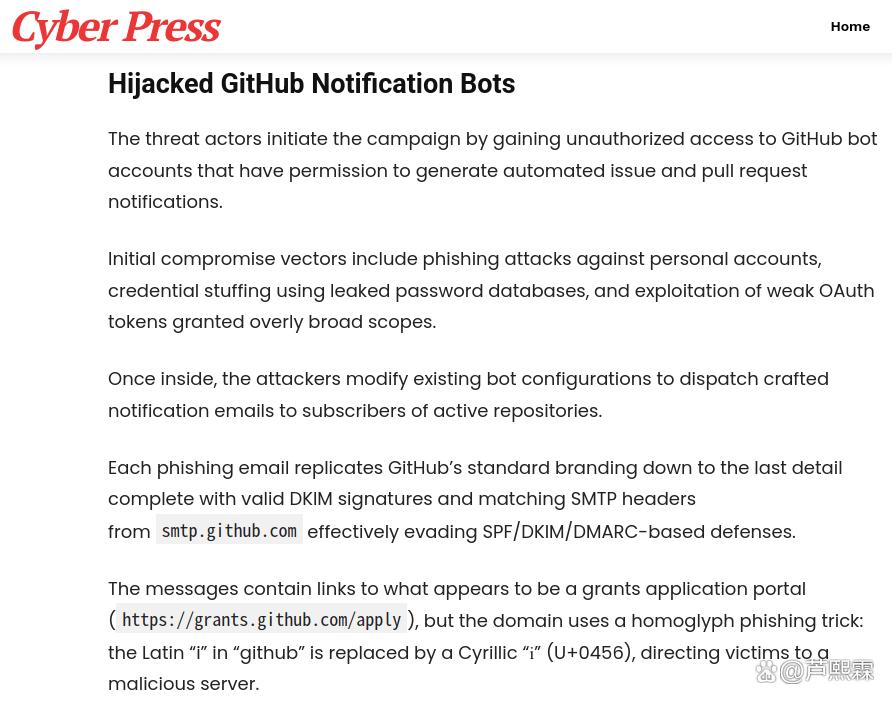 2025年9月,网络安全研究人员披露了一起利用被入侵GitHub Bot账号向开发者投递钓鱼邮件的新型攻击活动。攻击者通过伪造合法的Issue或Pull Request通知,诱导目标点击嵌入链接,进而窃取个人访问令牌(Personal Access Token, PAT)及OAuth授权凭证。此类攻击不仅绕过了传统基于SPF/DKIM/DMARC的邮件验证机制,还借助GitHub官方SMTP通道(smtp.github.com)发送邮件,使内容外观与真实通知几乎无法区分。更严重的是,一旦攻击者获得仓库写权限,即可直接篡改CI/CD流程、注入恶意构建脚本,甚至污染下游依赖包,形成典型的软件供应链攻击链。