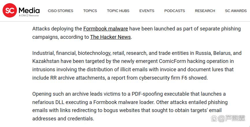Formbook作为一款活跃超过七年的信息窃取木马,因其模块化架构、凭证提取能力及较低的检测率,长期被各类威胁行为者用于针对高价值行业的定向攻击。2025年第三季度,网络安全机构F6与NSHC分别披露了两起独立但技术特征鲜明的Formbook投递活动,分别由“ComicForm”组织和亲俄黑客团体SectorJ149(又称UAC-0050)实施。前者聚焦俄罗斯、白俄罗斯与哈萨克斯坦的工业、金融及生物科技实体,后者则以韩国制造、能源与半导体企业为主要目标。尽管地理区域与行业分布不同,两类攻击均展现出对传统邮件安全防线的深度规避能力——通过非常规压缩格式(如RR、CAB)伪装恶意载荷,并结合社会工程诱饵实现初始突破。