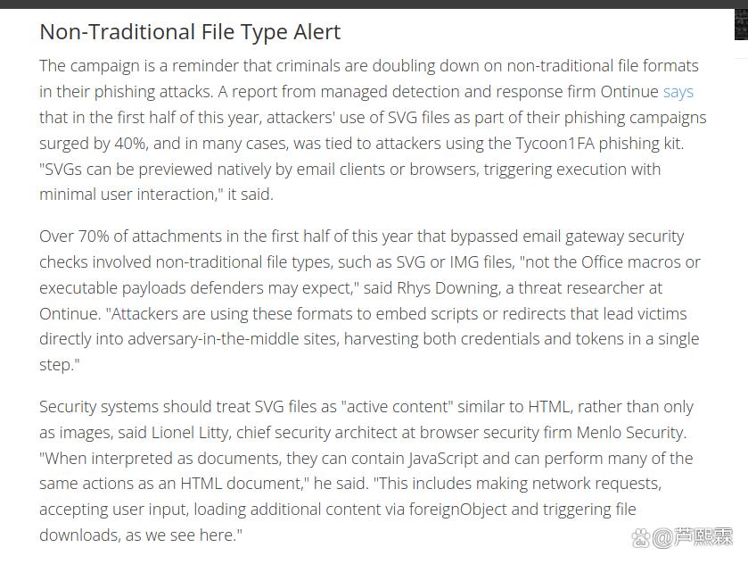 随着终端防护与网络边界安全能力的普遍提升,攻击者日益倾向于利用合法但易被忽视的文件格式作为初始入侵载体。此类格式通常具备脚本执行、网络通信或文件系统交互能力,却因历史用途“无害”而未被严格管控。可缩放矢量图形(SVG)即为典型代表——作为一种基于XML的开放标准图形格式,SVG被广泛用于网页图标、数据可视化及文档嵌入,主流浏览器均原生支持其渲染。然而,其内嵌JavaScript的能力使其成为理想的攻击跳板。