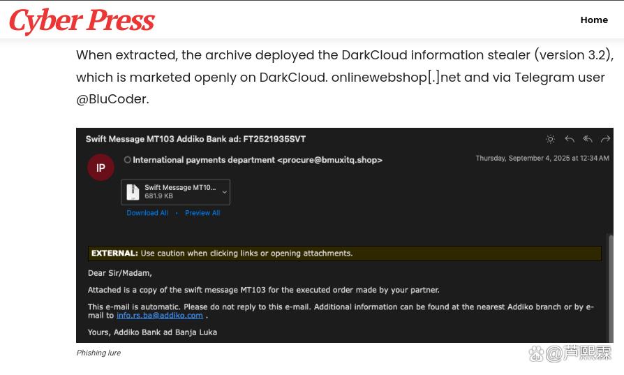 攻击始于一封主题为“Swift Message MT103 Addiko Bank ad: FT2521935SVT”的电子邮件,发件人地址经过仿冒,内容模仿标准SWIFT MT103格式,声称包含一笔跨境汇款的附加信息。该邮件被定向发送至目标企业的Zendesk支持邮箱(如support@company.com),利用客服人员处理财务相关工单的常规操作心理,提升打开率。