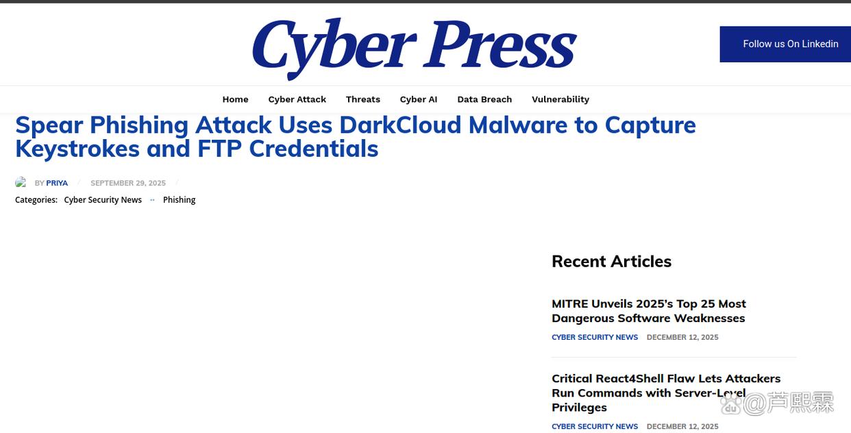 关键词:鱼叉钓鱼;信息窃取器;DarkCloud;Zendesk;VB6混淆;键盘记录;FTP凭据窃取;EDR检测