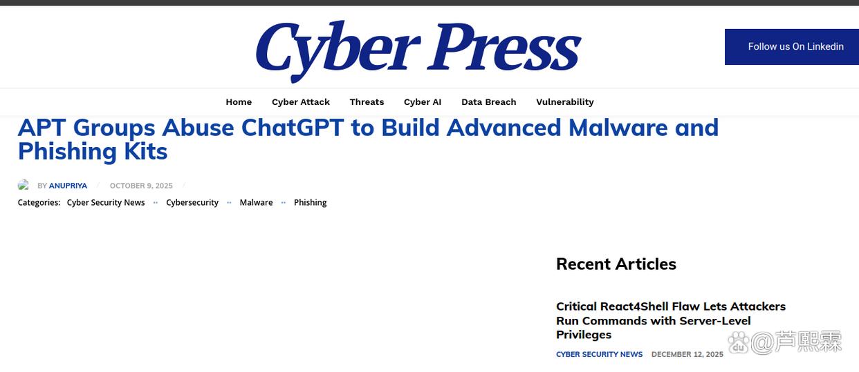 生成式人工智能(Generative AI)在过去两年中经历了爆炸式发展,其在文本生成、代码辅助、多语言翻译等任务上的表现已接近甚至超越人类平均水平。然而,技术的双刃剑属性在网络安全领域尤为凸显。2025年以来,包括UTA0388(中国关联)、APT-C-60、Scattered LAPSUS$ Hunters在内的多个APT组织被证实大规模滥用ChatGPT、Claude等商用LLM平台,将其作为攻击链前端的关键赋能工具。