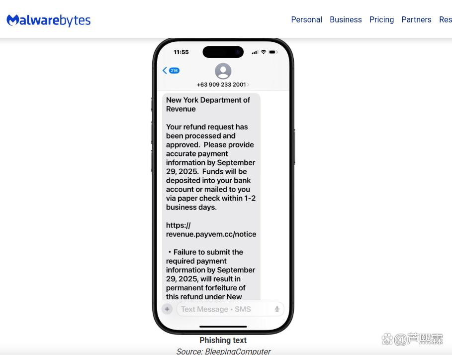 初始接触:通过国际短信网关(如菲律宾号码)发送伪装成“纽约州税务局”或“财政部”的短信;