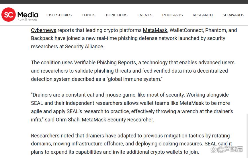 本文系统研究了SEAL联合主流钱包推出的基于可验证钓鱼报告(VPR)的实时防御网络。该机制通过结构化报告格式、去中心化验证流程与标准化分发协议,在保持Web3去中心化原则的前提下,显著缩短了钓鱼威胁从发现到拦截的响应时间。技术实现上,VPR强调链上可验证证据与最小化信任假设,避免引入新的中心化瓶颈。钱包端的集成方案兼顾实时性与可用性,项目方亦可通过智能合约主动接入,形成多层防御体系。