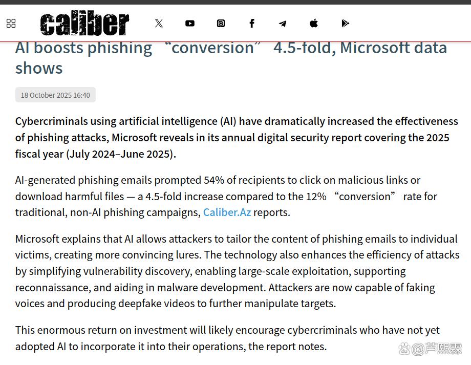 网络钓鱼作为最持久且高效的初始入侵手段,其技术演进始终紧随通信媒介与用户认知习惯的变化。2024至2025年间,人工智能——特别是大语言模型(Large Language Models, LLMs)——的普及为攻击者提供了前所未有的自动化与个性化能力。微软在其覆盖2024年7月至2025年6月的年度数字安全报告中披露,AI生成的钓鱼邮件成功诱导54%的收件人点击恶意链接或下载附件,相较传统钓鱼12%的“转化率”提升达4.5倍。这一数据不仅揭示了攻击效能的质变,更预示着网络钓鱼正从“广撒网”向“精准诱捕”转型。