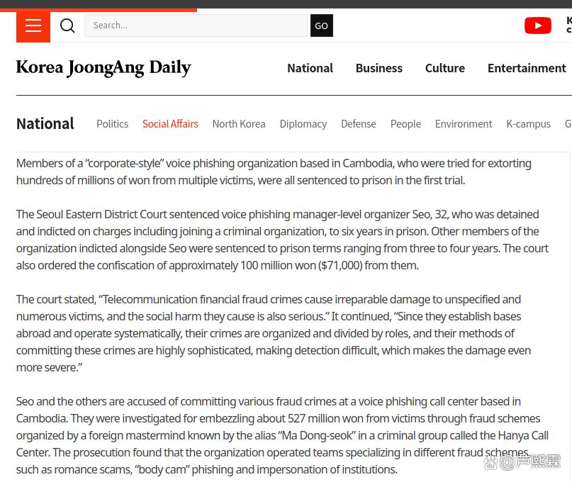 电信网络诈骗(Telecom Fraud)作为非接触式犯罪的典型代表,近年来在全球范围内呈规模化、产业化发展趋势。尤其值得关注的是,以柬埔寨、缅甸、老挝等东南亚国家为物理据点,针对韩国、日本、中国台湾等地区民众实施的“企业化”语音钓鱼(Voice Phishing)活动,已形成完整的黑色产业链。2025年10月,韩国首尔东部地方法院对“Hanya呼叫中心”案作出一审判决,标志着韩国司法机关对海外据点型电诈组织的打击进入新阶段。该案中,32岁的组织者徐某被判处6年有期徒刑,其余成员获刑3至4年,法院明确指出:“此类犯罪建立海外基地、系统化运作、角色高度分工、手法高度精密,导致侦查困难,社会危害极为严重。”