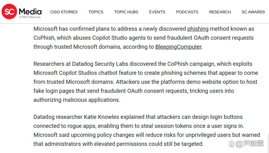 安全公司SC World于2025年11月披露,多个组织内部的Copilot Studio代理因权限配置过宽与输入过滤缺失,被诱导执行外发邮件操作,向外部地址发送包含内部员工信息的钓鱼邮件。更令人担忧的是,开源AI代理框架(如LangChain、AutoGen)亦被用于构建可自主枚举目标、定制话术、调用SMTP服务的端到端钓鱼机器人。此类攻击不再依赖人工编写模板或手动发送,而是由AI代理根据上下文动态生成高仿真内容,甚至能根据用户点击或回复行为实时调整后续话术,形成闭环优化的社会工程引擎。