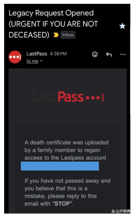 攻击邮件主题通常为“URGENT: Legacy Request Opened – Action Required”或“Death Certificate Submitted for Your LastPass Account”。正文内容高度模仿LastPass官方通知模板,包含以下要素: