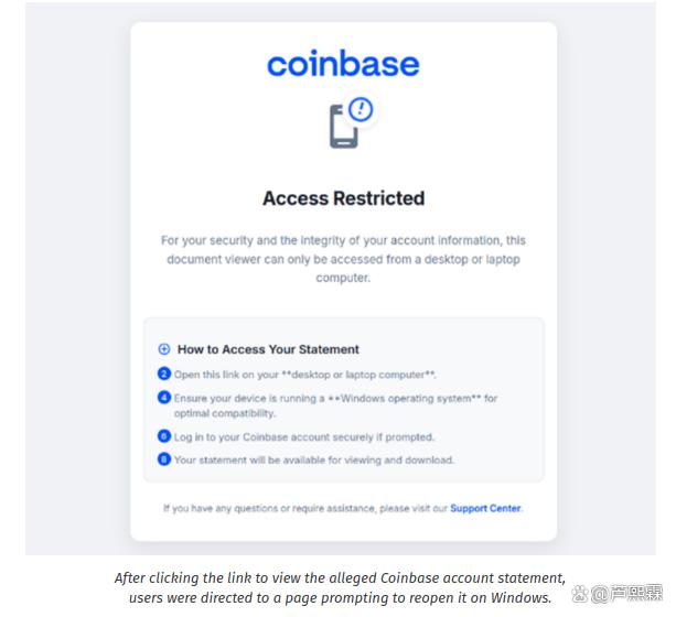 攻击始于一封主题为“Your Coinbase Account Statement is Ready”的邮件,发件人显示为“Coinbase Support <statements@coinbase-secure[.]net>”。邮件正文包含以下要素: