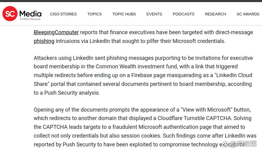 2025年初,多家安全厂商报告针对全球500强企业财务高管的LinkedIn钓鱼活动激增。攻击者精心伪造知名私募基金(如Blackstone、KKR)或战略合作伙伴身份,通过私信发送“尽职调查资料包”“紧急投资会议邀请”或“CFO职位机会”等诱饵,引导用户点击看似合法的链接。这些链接通常经多层重定向跳转至仿冒的Microsoft登录页面,或指向伪装成Google Docs/OneDrive预览的恶意载荷分发点。一旦凭证泄露,攻击者可直接访问企业邮箱、财务系统乃至ERP平台,实施发票欺诈、资金转移等高损操作。