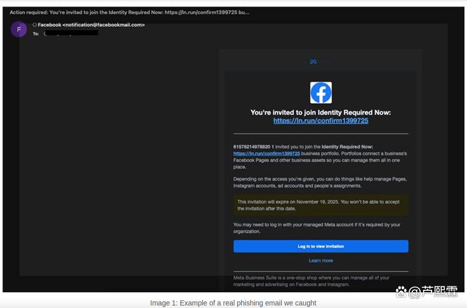 2025年11月,Check Point Harmony Email Security团队监测到一波针对北美、欧洲、澳大利亚等地中小企业的钓鱼活动。攻击者精心伪造Meta官方通知邮件,声称目标企业主页因“违反社区准则”被暂停,要求立即点击“申诉”按钮以恢复权限。邮件使用Meta品牌配色、官方图标及facebookmail.com子域发件,极具迷惑性。受害者被导向托管于vercel.app等合法云平台的钓鱼表单,提交邮箱、密码及一次性验证码后,攻击者随即接管账号,篡改管理员角色、导出客户数据或投放诈骗广告。