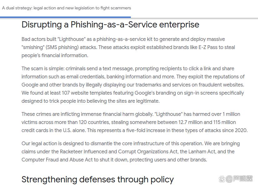 近年来,以“钓鱼即服务”(Phishing-as-a-Service, PhaaS)为代表的诈骗基础设施呈现高度模块化、跨境化与自动化特征,尤其在短信(smishing)与邮件渠道中,通过仿冒知名品牌诱导用户泄露凭证或支付信息。2025年11月,Google宣布对名为“Lighthouse”的PhaaS运营者提起民事诉讼,并同步推动多项美国联邦立法提案,旨在从法律、政策与技术三方面系统性瓦解诈骗产业链。本文基于该事件,剖析PhaaS的技术架构与运营模式,评估传统防御手段的局限性,并论证“法律行动+公共政策+平台协作”三位一体治理框架的有效性。研究指出,仅靠终端检测难以根除此类规模化攻击,必须通过司法手段冻结域名、支付通道与核心基础设施,同时辅以强制性通信规范(如A2P短信注册、来电显示认证)与企业级品牌防护策略(如DMARC p=reject、FIDO2强制认证)。文中提供可落地的技术实现方案,包括自动化域名监控脚本、CI/CD中的品牌资产扫描逻辑及基于威胁情报的IOC集成示例,为企业构建纵深防御体系提供参考。