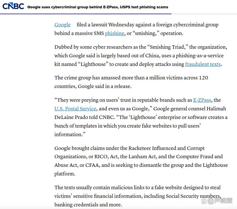 关键词:短信钓鱼;仿冒品牌;Lighthouse平台;RICO诉讼;移动安全;STIR/SHAKEN;威胁情报