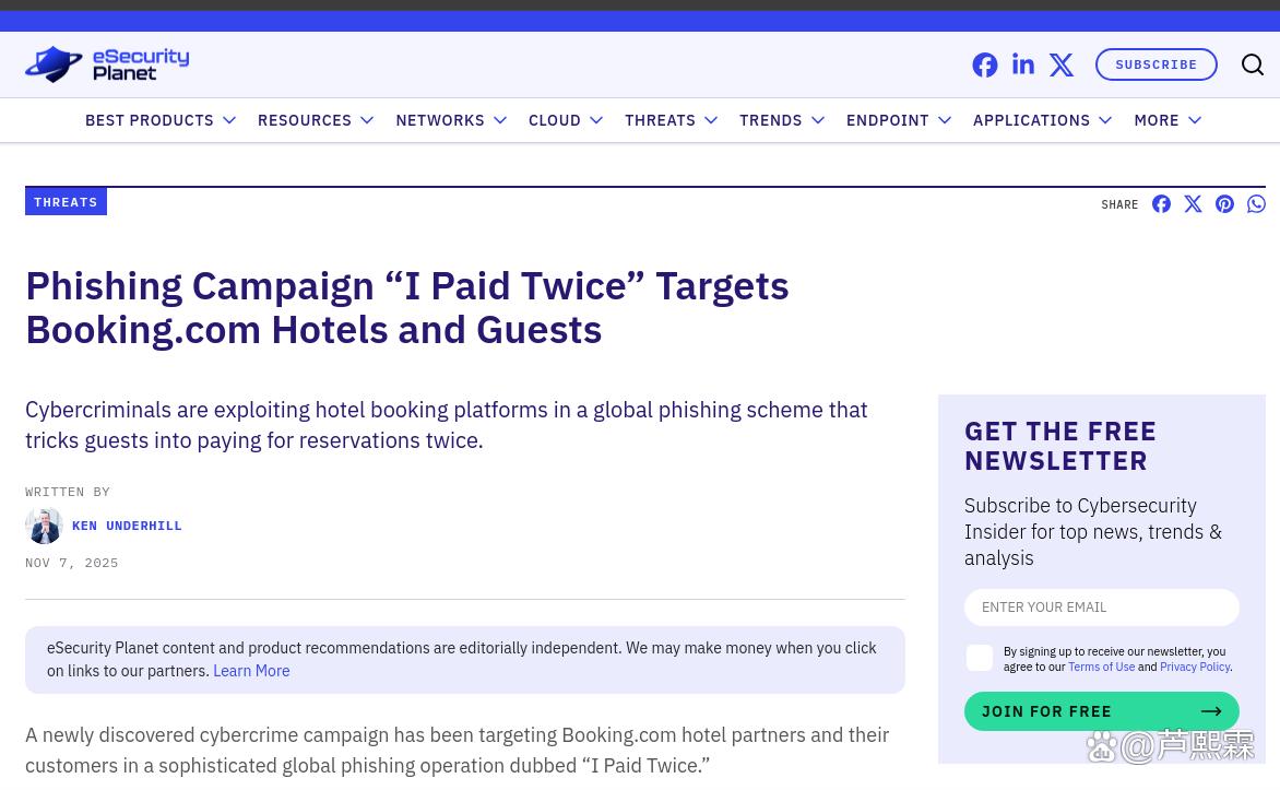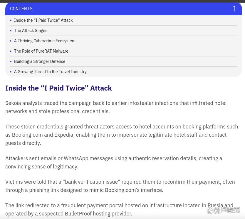 在线旅游平台(Online Travel Agency, OTA)作为连接全球数百万酒店与旅客的核心中介,其通信系统承载着预订确认、入住协调、支付争议等关键业务交互。然而,这一高信任度通道正被攻击者系统性滥用。2025年第三季度,安全媒体披露了一起针对Booking.com生态的钓鱼活动,攻击者以“重复扣款”为诱饵,诱导酒店前台或旅客点击链接,进而窃取支付卡信息与账户凭证。该攻击的独特之处在于其双向欺骗性:既可伪装成旅客向酒店索要“退款”,也可冒充客服通知旅客“系统错误需验证”,从而覆盖整个交易链条。