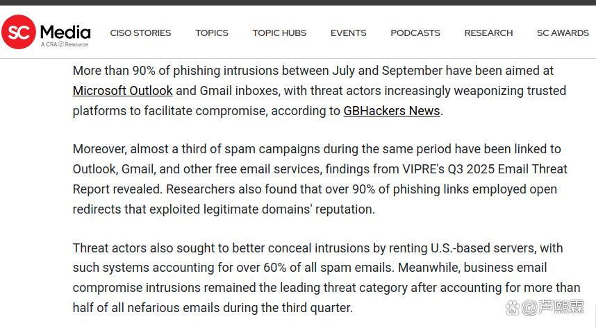 近年来,随着企业办公全面向云端迁移,Microsoft Outlook 与 Google Gmail 等主流云邮箱平台成为网络钓鱼攻击的主要目标。攻击者利用社会工程话术结合技术绕过手段,显著提升攻击成功率,对组织身份安全构成严峻挑战。本文基于2023–2025年多起真实事件分析,系统梳理当前针对云邮箱的钓鱼攻击演进路径,重点剖析其在身份验证层、邮件过滤机制及用户交互界面三个维度的突破策略。在此基础上,提出一套融合FIDO2/Passkeys强认证、条件访问策略、协议精简、内容隔离与快速响应机制的纵深防御框架,并通过代码示例说明关键控制点的技术实现。研究结果表明,仅依赖传统反钓鱼网关已难以应对新型复合式攻击,必须从身份、协议、内容与流程四个层面协同重构企业邮箱安全体系。