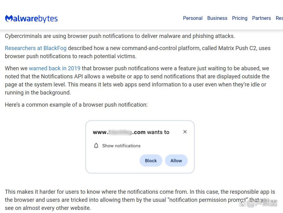 Matrix Push C2代表了无文件攻击与合法Web API滥用的深度融合。其利用浏览器通知机制构建持久化C2通道,不仅规避了传统终端与网络防御,还利用用户对系统通知的信任心理提升攻击成功率。本文通过技术拆解揭示了其从权限诱导到载荷投递的完整链条,并指出当前安全体系在权限治理、运行时可见性与上下文理解方面的不足。
