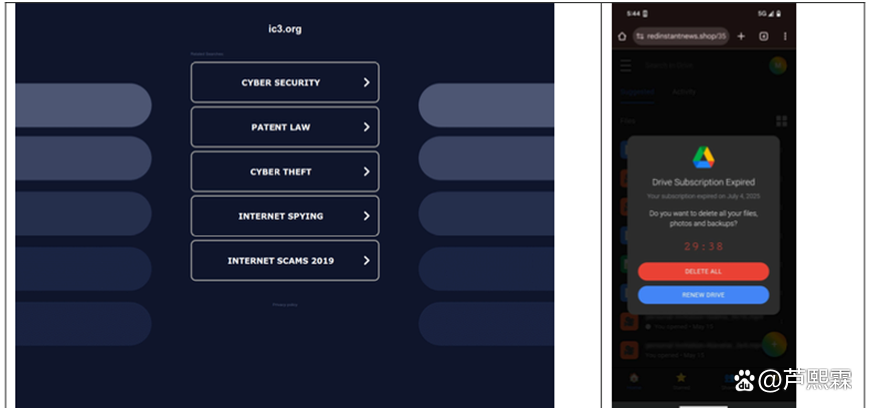 联邦调查局互联网犯罪投诉中心网站的类似域名返回了一个非威胁性停车页面(左),而移动用户在2025年10月立即被引导到欺骗性内容(右)。图片:Infoblox。