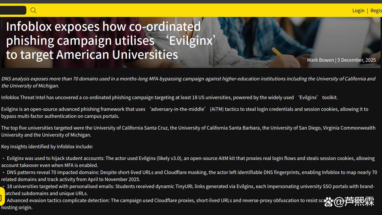 此次行动中,攻击者利用Evilginx——一个专为会话劫持设计的开源反向代理框架——构建了70余个伪装成大学单点登录(SSO)门户的钓鱼站点。受害者点击邮件中的链接后,被导向高度仿真的登录页;其输入的用户名、密码及MFA响应被Evilginx实时转发至真实服务器,而返回的会话Cookie则被截留。攻击者随后使用该Cookie直接访问邮箱、云存储及内部应用,全程无需知晓用户凭证。