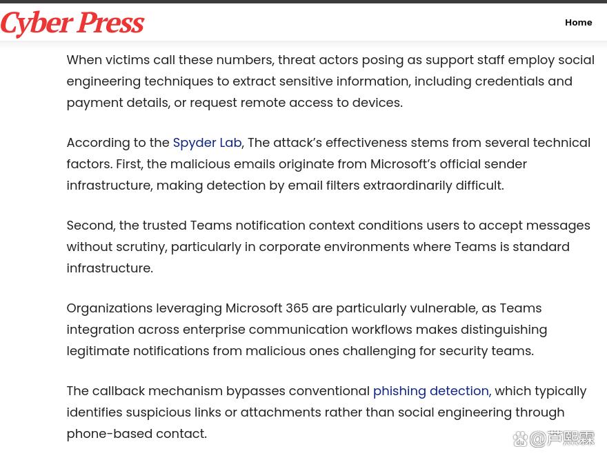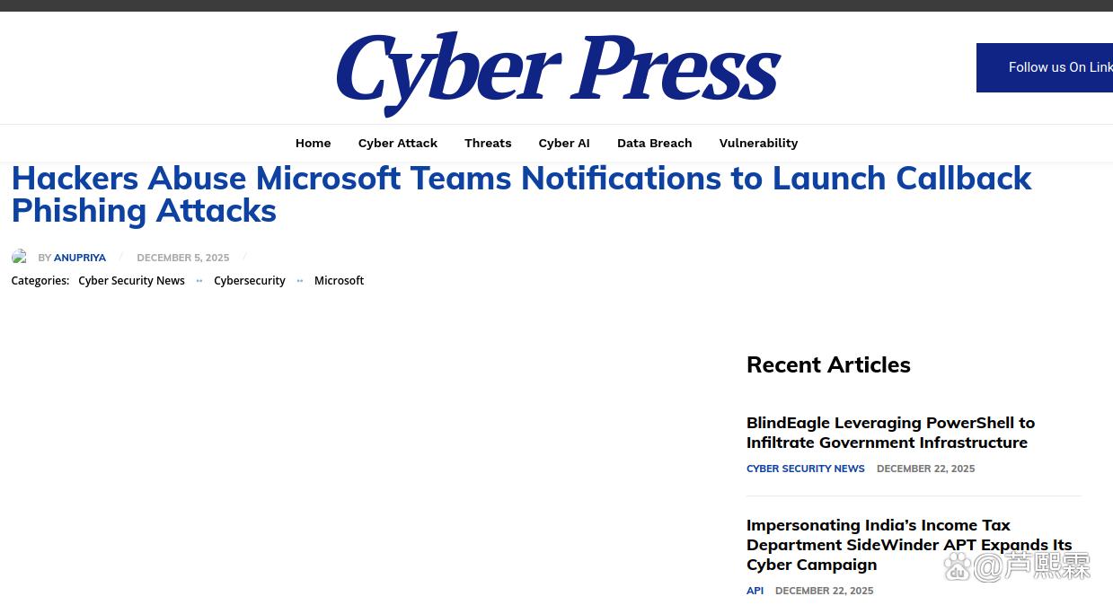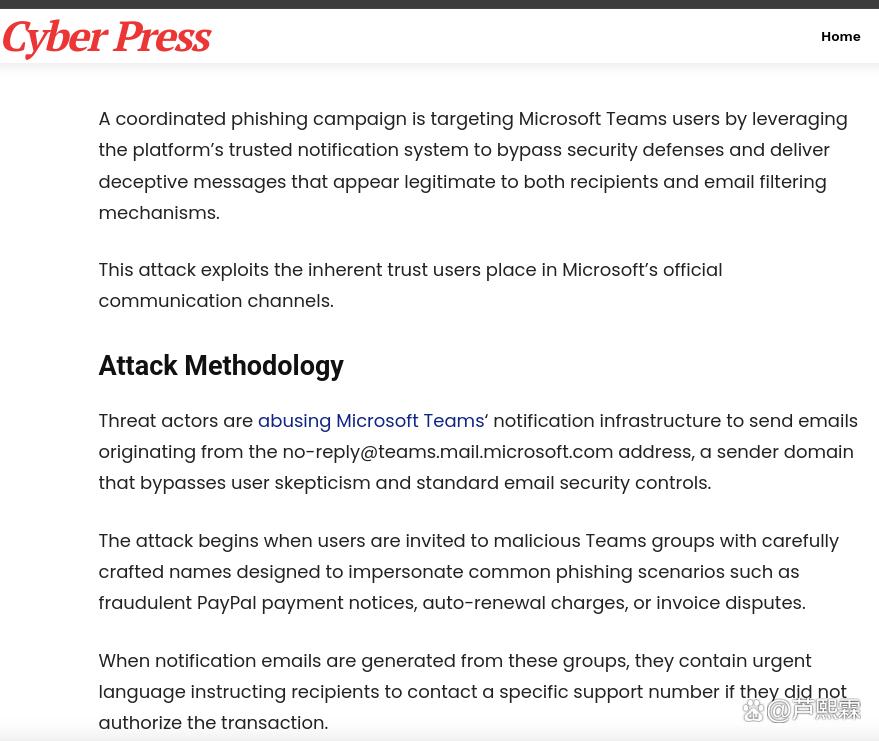 企业协作平台如Microsoft Teams、Slack和Zoom已成为现代办公环境的核心基础设施。其集成的消息、会议、文件共享与通知功能极大提升了工作效率,但也因其高可信度成为攻击者觊觎的目标。2025年12月,网络安全媒体Cyber Press披露了一起针对全球企业的协调性钓鱼活动,攻击者通过滥用Microsoft Teams的通知邮件通道,发起一种以“用户主动回拨”为特征的新型社会工程攻击。与传统钓鱼不同,此类攻击不依赖恶意链接或附件,而是利用用户对平台通知的信任,诱导其主动联系攻击者控制的“客服热线”,进而在电话中完成凭证窃取或系统接管。