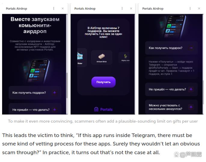 点击链接后,用户被导向一个高度仿真的Mini App。攻击者通常复制合法平台(如Portals Market)的UI组件,包括Logo、配色方案及按钮布局。关键伪造点包括: