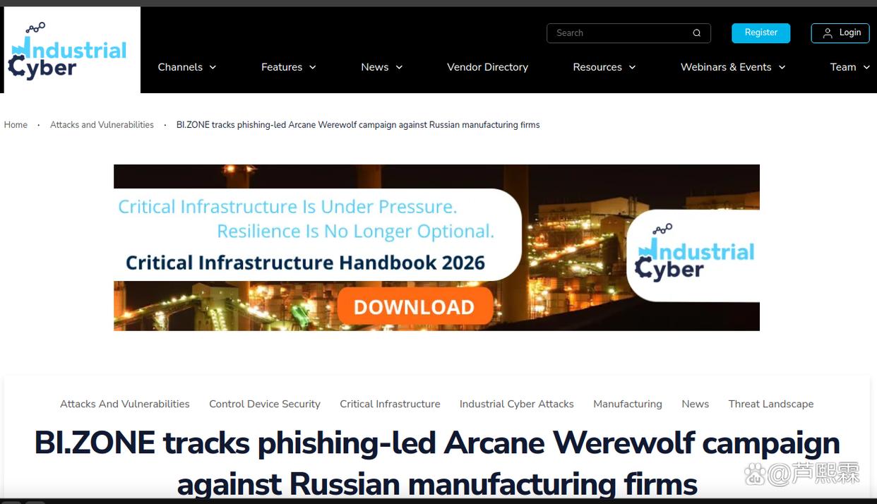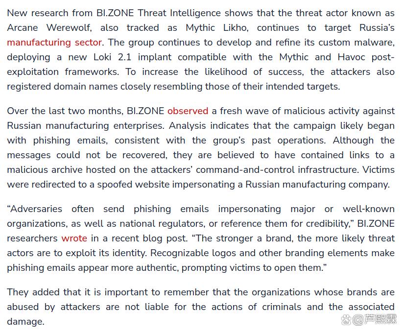 Arcane Werewolf(亦称Mythic Likho)自2023年起活跃,主要针对俄语区国家的关键基础设施,尤以能源与制造业为重点。2025年10月至12月间,BI.ZONE观测到该组织新一轮攻击浪潮,目标明确指向俄罗斯境内拥有国家级产能资质的制造企业,包括重型机械、化工原料及精密仪器制造商。