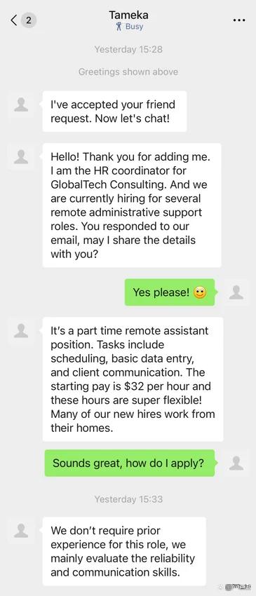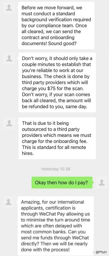 WeChat Pay支持跨境转账、商户收款及个人间即时结算,且交易一旦完成难以撤销。攻击者常以“背景调查费”“保证金”“紧急采购款”等名义诱导受害者小额转账,既降低警惕性,又便于测试目标是否“易骗”。若首次得手,后续可能升级为大额勒索或商业欺诈。
