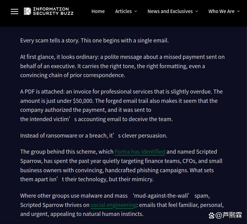 上述TTPs表明,Scripted Sparrow的成功并非依赖单一技术突破,而是通过将传统社会工程与现代自动化工具链深度融合,形成“侦察-生成-投递-收割”的闭环攻击体系。