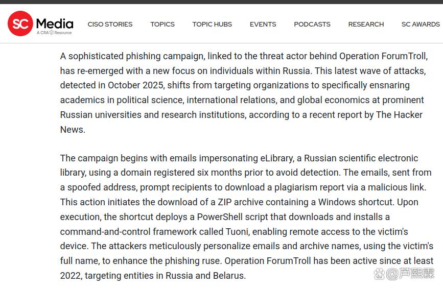 近年来,国家级网络间谍活动日益将学术机构视为关键情报来源。相较于传统军事或政府目标,高校和智库往往安全防护薄弱,却掌握大量未公开的地缘政治研判、经济模型与政策建议,具有极高的战略价值。2025年末,网络安全公司SC World披露,“Operation ForumTroll”——一个曾于2018–2020年间活跃、疑似与东欧背景有关的APT组织——再度启动攻击行动,其目标明确指向俄罗斯境内多所顶尖大学的研究人员。