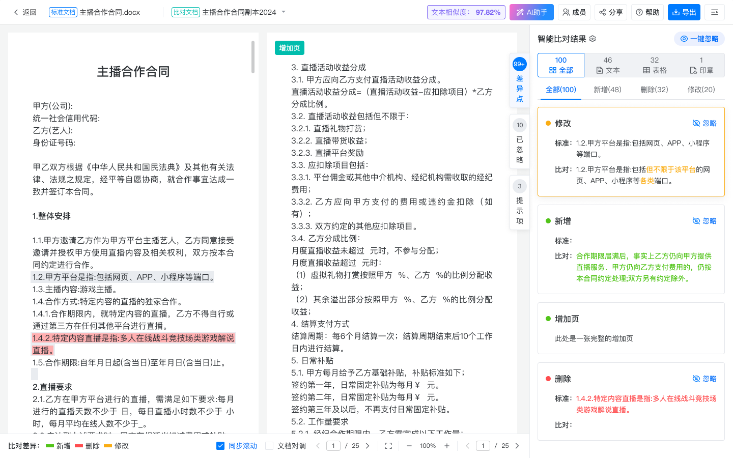 智能版本对比:自动识别多轮磋商中的条款增删改,高亮标注差异并生成修改轨迹,减少 80% 人工比对工作量,跨部门审核周期缩短 50% 以上;