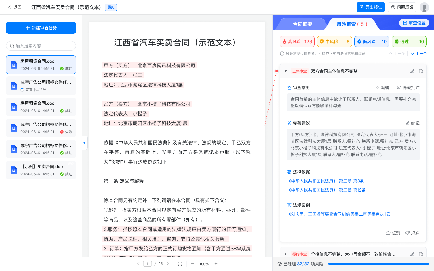 AI 风险审查:内置覆盖法规、行业政策、企业规范的动态规则库,通过自然语言处理逐句扫描合同,自动标注付款条件缺失、争议解决条款不合理等风险点,并关联司法判例给出修改建议,风险识别覆盖率提升至 95%+;