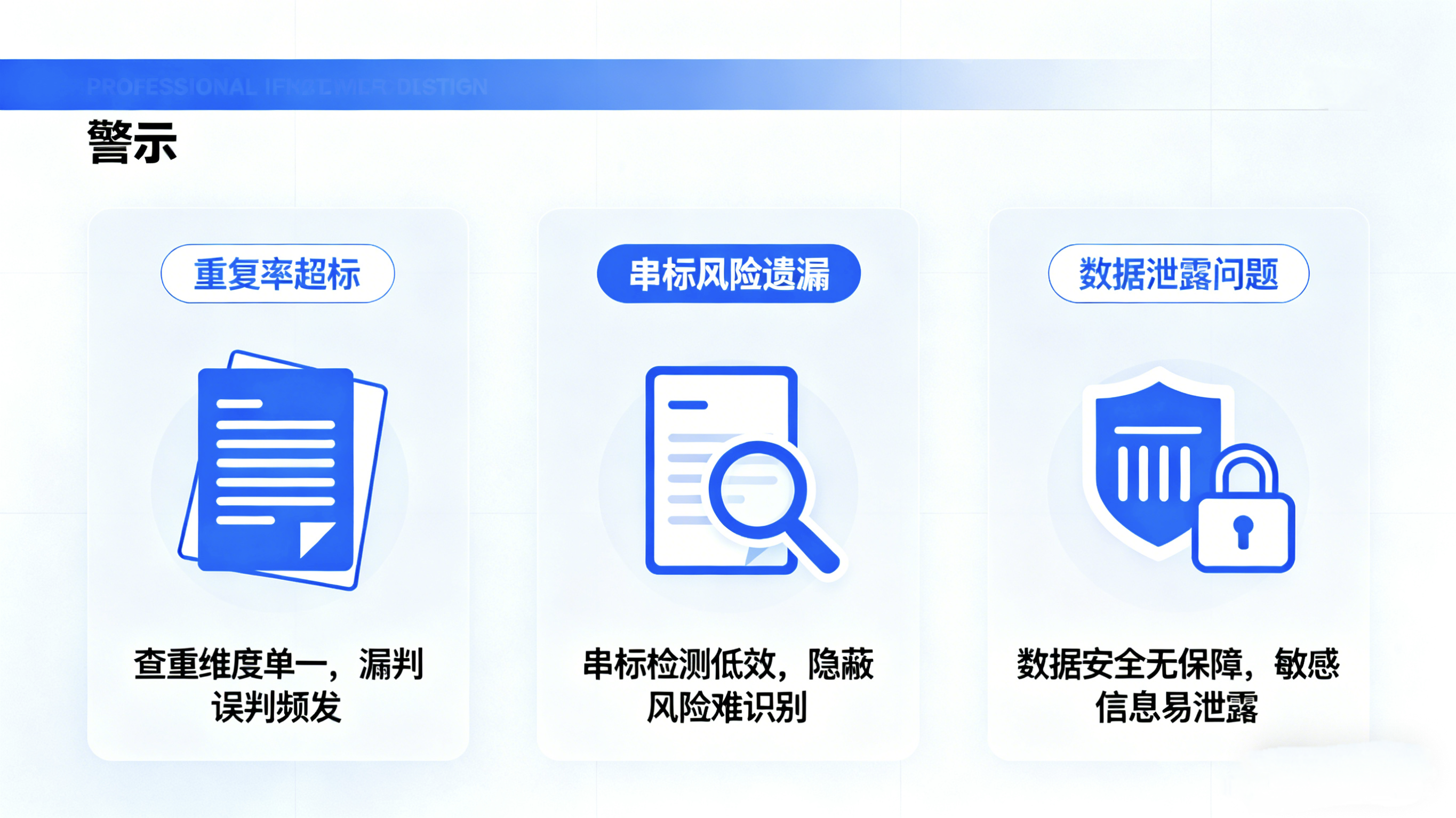 投标过程中,重复率超标、串标风险遗漏、数据泄露是导致合规失败的核心症结,传统工具的局限性让防控难上加难: