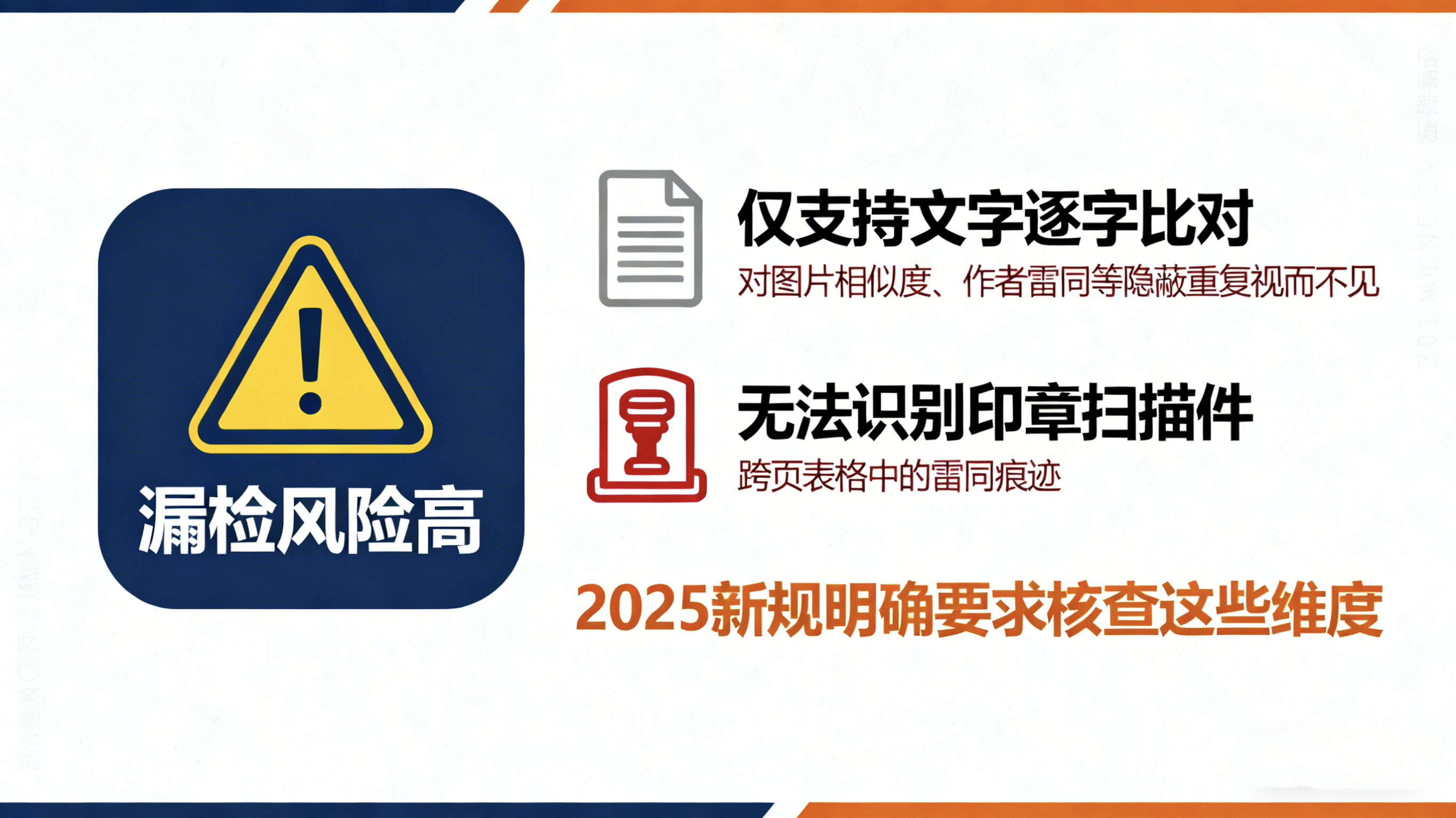 漏检风险高:仅支持文字逐字比对,对图片相似度、作者雷同等隐蔽重复视而不见,更无法识别印章扫描件、跨页表格中的雷同痕迹,而 2025 新规明确要求核查这些维度;