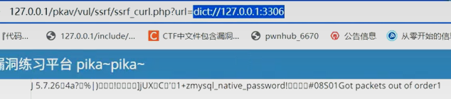 所以像 mysql 的服务,因为也是基于 tcp 协议开发,所以用 dict 协议的方式打开也能强行读取一些 mysql 服务的返回内容