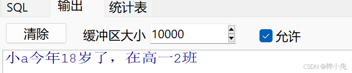dbms_output.put_line(v_name||'今年'||v_age||'岁了,在高一'||v_class);