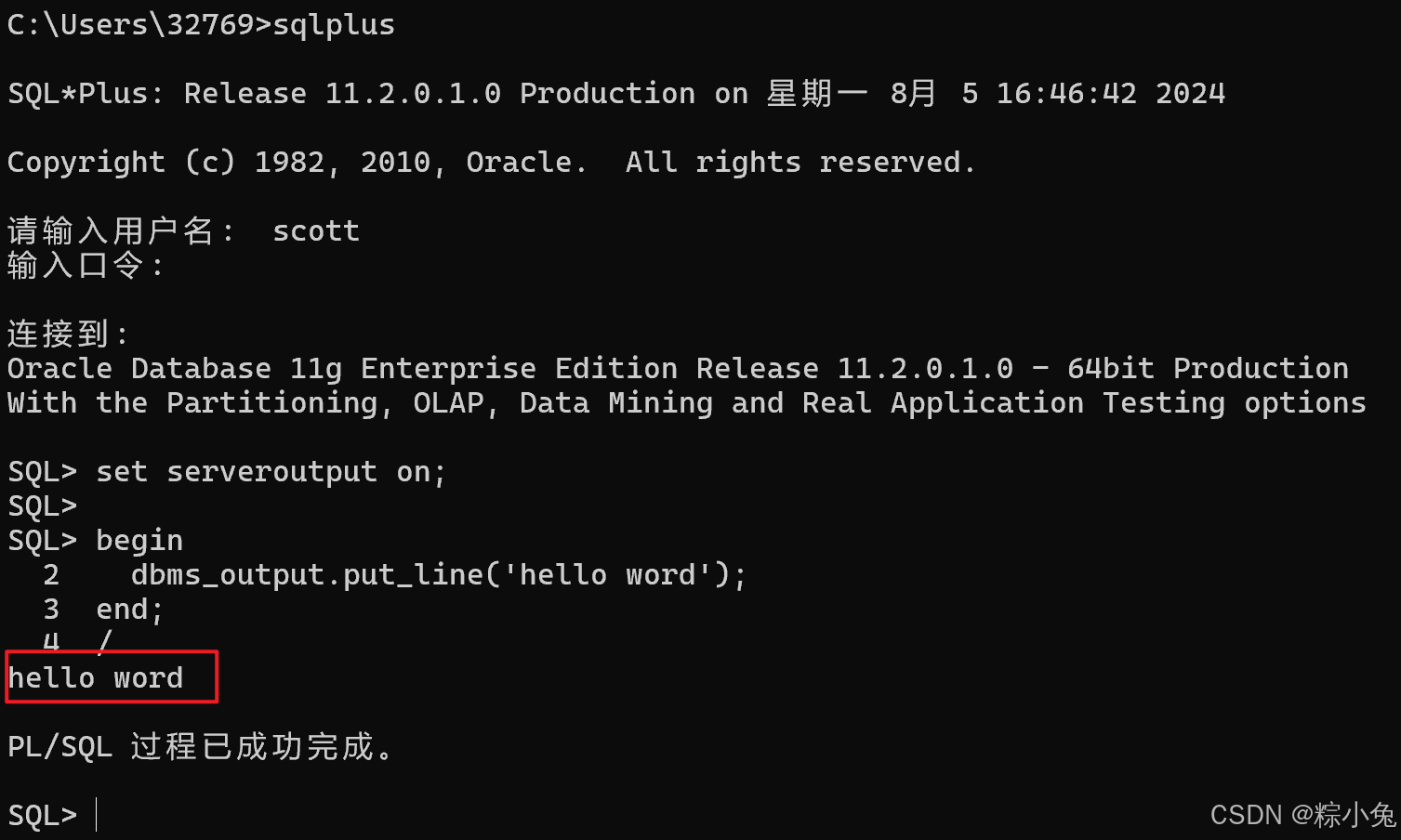 1、SQL*PLUS客户端默认情况下输出选项是被关闭的,我们需要打开后才可以将结果打印到控制台。命令:set serveroutput on;