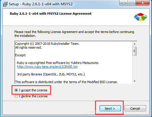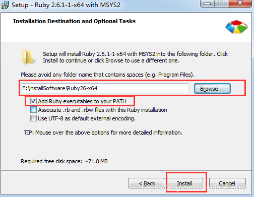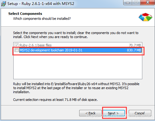 <3> 我们配置sass环境不需要MSYS2,所以此处取消掉安装MSYS2的复选框(默认选择,当然不取消对sass也没有影响),然后点击next。