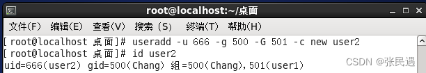 该案例中 用户名为user2,用户id为666,主组id为500,附加组id为501,注释为new。