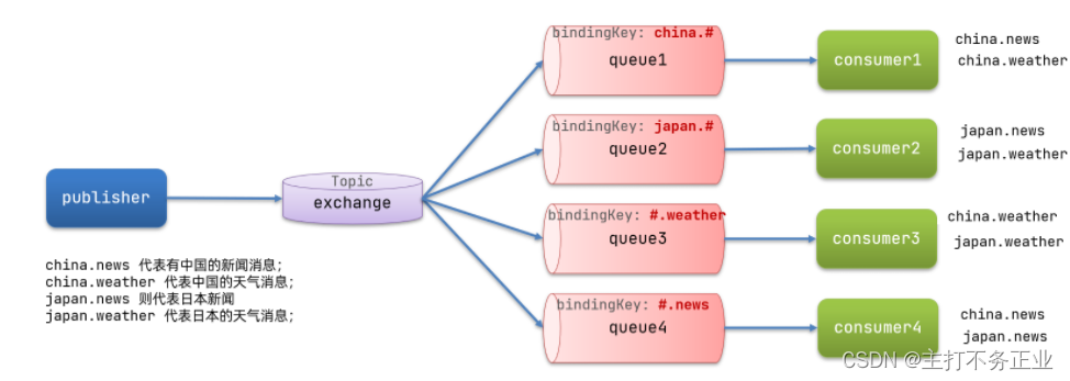 Topic类型的Exchange与Direct相比,都是可以根据RoutingKey把消息路由到不同的队列。只不过Topic类型Exchange可以让队列在绑定Routing key 的时候使用通配符!